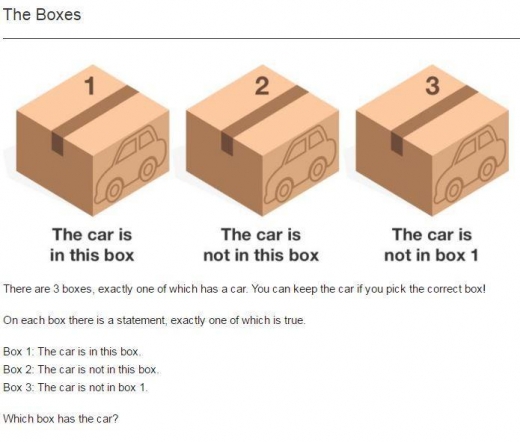 이중 1개의 상자에만 진실이 적혀 있고 나머지 2개의 상자에는 거짓이 적혀 있다. 그렇다면 어떤 상자 안에 자동차가 들어 있는 것일까?