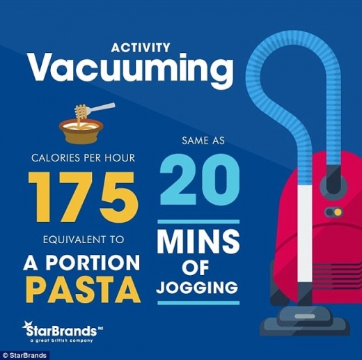 물론 1시간 동안 ‘청소기’(Vacuuming)를 돌리는 것도 좋다. 이는 20분간 달리기한 것과 같으며 무려 175칼로리를 태운 것과 맞먹어 식사 때 약간의 파스타를 더 먹었더라도 그 효과를 상쇄한다.