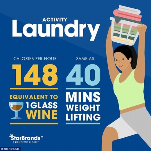 빨래를 돌리고 개는 일도 체중감량에 도움을 준다. 시간당 무려 148칼로리를 소모하며 저녁에 마셨던 중간 크기 와인 1잔의 열량을 없애준다.