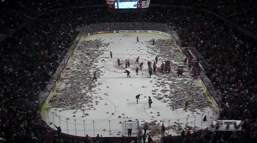 이날 경기장을 찾은 1만 7601명의 관중은 총 2만 3924개의 테디베어를 링크 안에 던져 그야말로 경기장은 인형들로 가득찼다. 특별한 이 행사는 바로 올해로 22회째를 맞는 전통 이벤트인 ‘테디베어 토스’(Teddy bear toss).