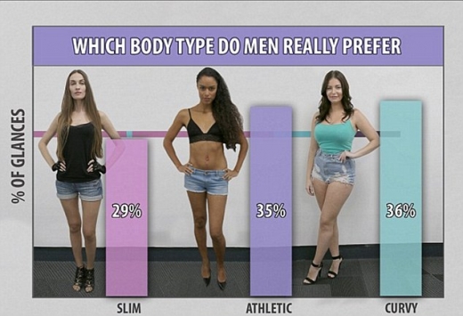 그 결과 총 36%의 관심을 받은 굴곡진 몸매의 여성이 1위를 거머쥐었다. 2위는 탄탄한 근육을 가진 몸매의 여성(35%)이, 3위는 마른 여성(29%)이 차지했다.