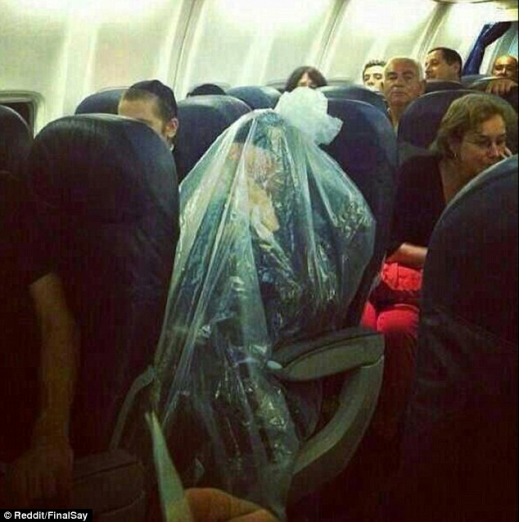 또 다른 사진은 한 남성이 몸 전체를 거대한 투명 비닐봉지로 감싼 채 좌석에 앉아 있는 모습을 담고 있다. 데일리메일에 따르면 해당 남성은 유대인으로 추정되며, 비행기 내부가 청결하지 않다는 이유로 이같은 행동을 한 것으로 알려졌다.