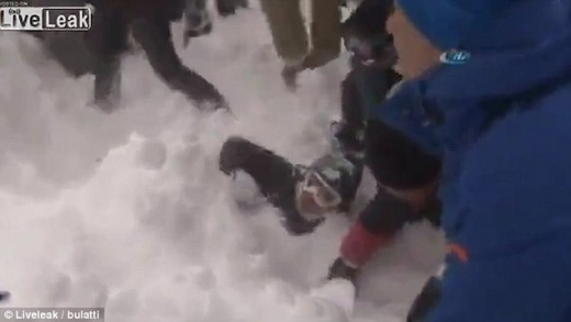 무너져 내린 눈 아래에 사람이 깔려 있었고, 주변에 있던 사람들은 눈을 파헤치며 눈에 깔린 사람을 꺼내기 위해 애쓰고 있었다.