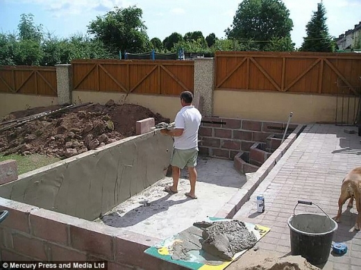 재미삼아 판 구멍이 자신의 오랜 바람을 이뤄줄수 있을거라 생각했던 그는 수영장 건설 작업에 들어갔다. 가능한 모든 재료를 싸게 구하기 위해 헌 폐자재 처리장에 있는 타일과 나무를 재활용했고, 총 300파운드(약 44만원)의 비용을 들여 혼자 힘으로 일주일만에 18.6㎡(약 6평) 크기의 수영장과 사우나를 만들었다.