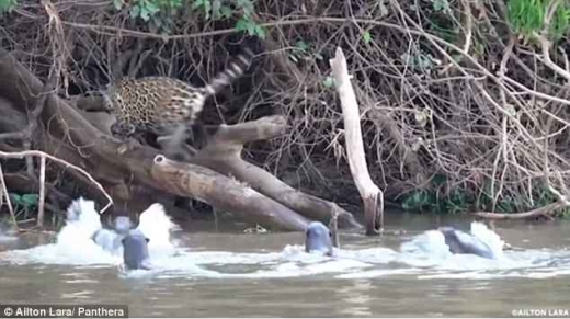 브라질 야생동물 보호단체 ‘판타날 네이처’의 책임자 아일톤 라라는 블로그를 통해 최근 브라질 판타나우에서 재규어 한 마리가 자이언트수달 무리에게 쫓겨나는 장면을 촬영해 공개했다.