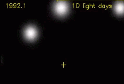 정확히 말하면 블랙홀은 관측이 어려우므로, 적외선 자료에 기초해 그 주변에 있는 별들의 움직임을 보여주는 것이다.