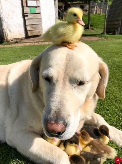 대형견 래브라도 리트리버가 어미 잃은 새끼 오리들의 아빠를 자처하고 나섰다.