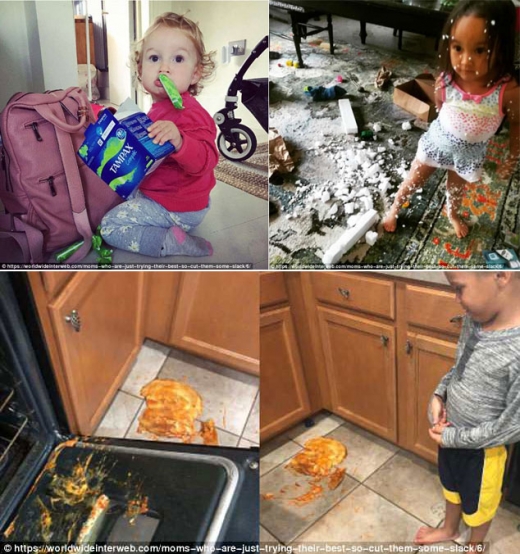 공개된 사진들은 대체로 어머니들이 너무 바빠 아이에게서 잠시 한눈을 팔았을 때 벌어진 불상사들을 담고 있다.