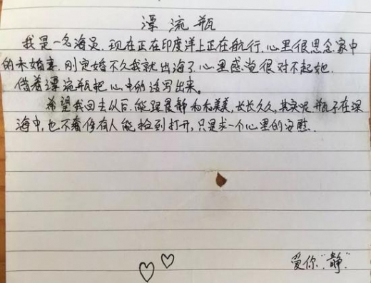 “나는 선원이다. 지금 인도양을 항해 중이다. 약혼녀가 몹시도 그립다. 약혼한 지 얼마 안 돼 바다로 나와 그녀에게 정말 미안하다. 이 병에 내 마음속 사랑을 담아 써 내려 간다. 집에 돌아가면 징(静)과 함께 아름답고 긴 세월을 보낼 것이다. 이 병이 바다를 표류하며 사람들의 손길에 닿을 것이란 기대는 없다. 다만 내 마음 한 조각의 위안을 삼는다”
