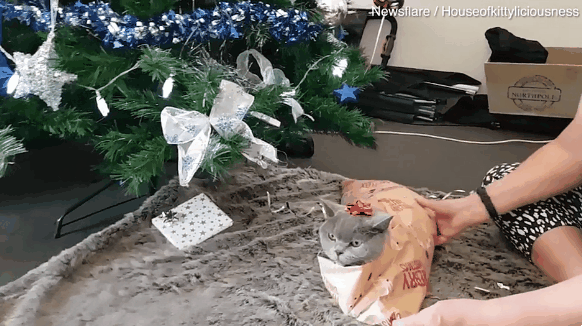 고양이 스쿠터는 지난해 크리스마스 즈음에도 똑같이 ‘포장’돼 크리스마스 선물로 변신하는 모습의 동영상으로 유명해졌다. 당시 동영상 역시 6900만 조횟수를 기록했을 정도다.
