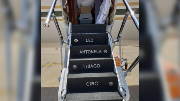 보다 확실한 증거는 비행기에 탑승할 때 이용하는 계단에 있다. 계단엔 칸마다 '레오', '안토넬라', '티아고, '시로', 마테오'라는 5개 이름이 인쇄돼 있다. 메시 부부와 세 아들의 이름이다.