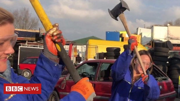 현재 BBC 홈페이지에서 가장 많이 본 뉴스로도 기록되고 있는 이 영상에서 고객들은 저마다 고글과 방호복을 입고 커다란 해머나 야구 방망이, 또는 골프채를 들고 폐차된 자동차를 때려 부순다.