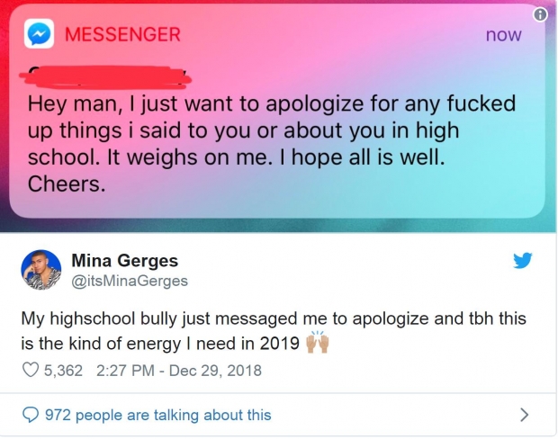 그는 이 같은 내용과 함께 트위터에 “고등학교 때 날 괴롭힌 학생이 사과하는 메시지를 보내왔다”면서 “2019년에는 이런 게 필요하다”고 말했다.