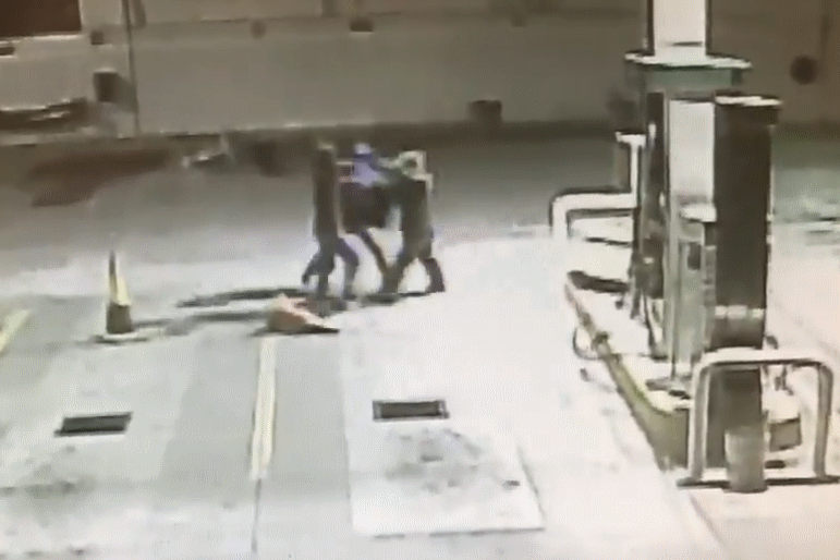 순순히 지갑을 내놓지 않자 강도들은 주먹을 휘두르기 시작한다. 주유원의 목을 잡고 밀치면서 바닥에 쓰러뜨리는 장면도 나온다.