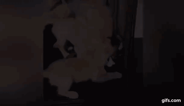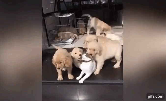 강아지들만 있는 줄 알았던 찰나 새끼들 사이로 고양이 머리 하나가 쏙 올라온다. 가만 보니 고양이 한 마리가 새끼 리트리버들에게 둘러싸여 오도가도 못하는 상황이었던 것. 리트리버 새끼들은 고양이가 너무 좋아 어쩔 줄 몰라하며 끊임없이 고양이에게 치대고 있다. 이런 리트리버들이 마냥 귀찮은 고양이는 이리 치이고 저리 치이다 회심의 펀치를 날려보았지만 이마저도 소용없다.