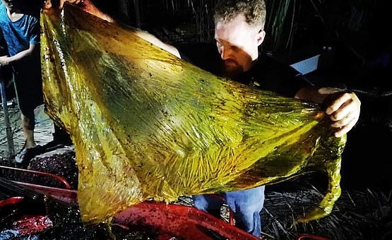 다바오자연사박물관 해양생물학자 다렐 블래츨리는 지난 15일 필리핀 민다나오섬 다바오의 콤포스텔라밸리주의 한 해안에 휩쓸려온 민부리고래가 있다는 연락을 받았다. 그가 현장에 도착했을 때 고래는 이미 피를 토하며 죽어 있었다. 다렐은 “고래의 배 속에서 16개의 쌀자루, 바나나 재배용 자루, 비닐봉지 등 40㎏에 달하는 플라스틱 쓰레기가 나왔다”고 밝혔다. 그는 이 고래가 플라스틱 쓰레기로 인해 먹이를 섭취하지 못하고 탈수증으로 죽었다는 검사 결과를 내놨다.