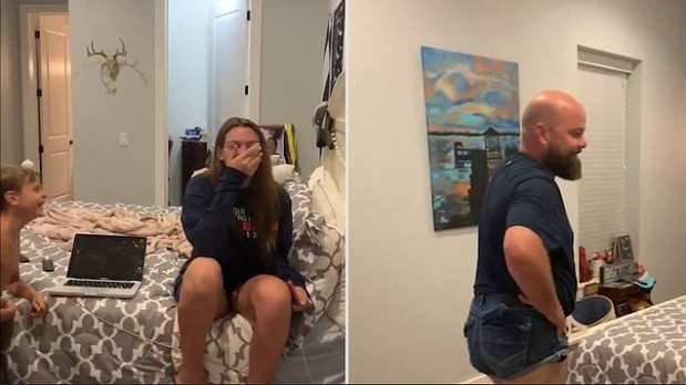 함께 들어온 그의 아들은 그만 웃음을 터뜨리고 말지만, 남성은 딸에게 “너도 네 반바지를 입어라. 누가 더 잘 맞는지 보자”고 말하며 자신이 준비한 말을 이어간다.