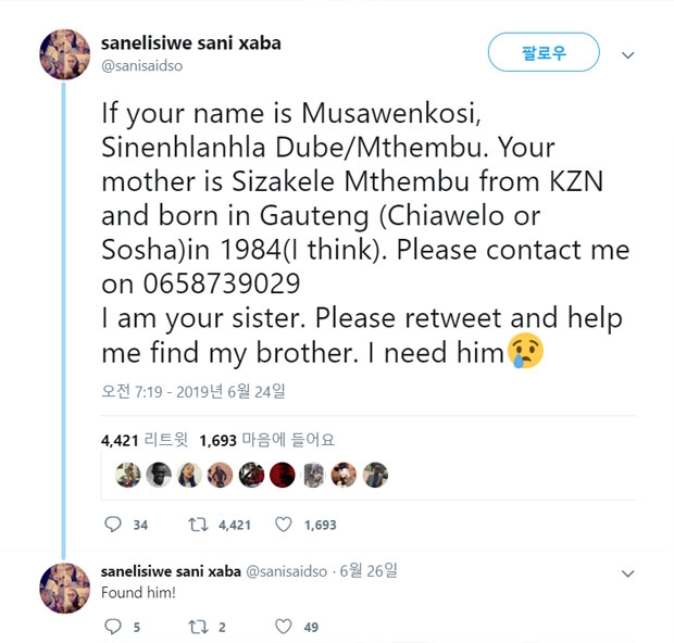 문득 소셜미디어(SNS)의 힘을 빌려보면 어떨까 생각한 그녀는 지난 24일 오후 5시경 트위터에 오빠를 찾는다는 글을 올렸다. 사바는 “1984년 치와웰로 혹은 소샤에서 태어났으며, 이름은 무사웬코시 시넨란라 두베/멤부이고 어머니가 콰줄루나탈 출신의 시카메레 멤부인 사람은 꼭 연락 달라”고 호소했다. 다음 날 아침, 그녀에게 믿을 수 없는 일이 벌어졌다. 27년 전 헤어진 오빠를 찾아 나선 지 하루도 채 되지 않아 소재가 파악된 것. 그녀는 “무슨 일이 벌어진 건지 정신을 차릴 수가 없었다. 이렇게 빨리 찾을 줄은 몰랐다”고 말했다.