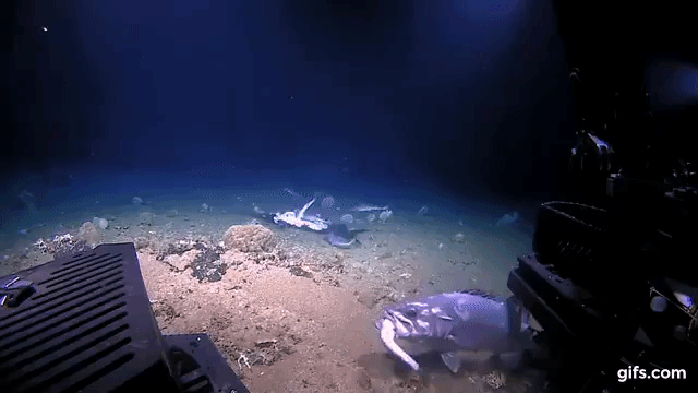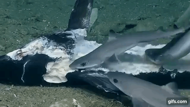 상어 무리가 게걸스럽게 뜯어먹던 먹이는 바로 몸길이가 2.5m 정도 되는 죽은 황새치 한 마리였다. 이 물고기는 알 수 없는 이유로 죽은 뒤 이곳 해저까지 가라앉은 것이다.