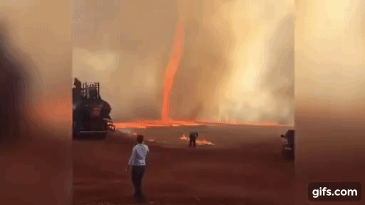 ‘파이어 토네이도’는 화재로 뜨거워진 지표면의 공기가 상층부의 저기압을 만나면서 화염을 폭발적으로 끌어올리는 현상으로 고온과 난기류, 낮은 습도, 건조한 토양 등의 조건이 모두 갖추어져야 한다. 회전 구조는 토네이도와 비슷하다.