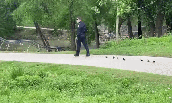 폭스뉴스 등 현지매체에 따르면, 지난 12일(현지시간) 텍사스주 휴스턴 메모리얼파크에서 한 경찰관이 새끼 오리들에게 어미를 찾아주는 임무를 수행했다.