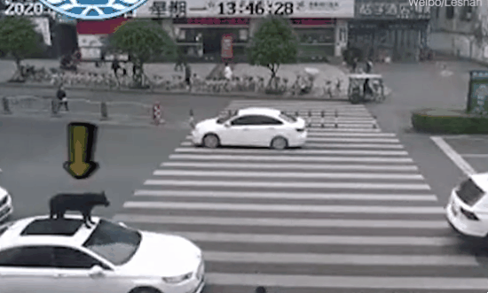 현지 시간으로 22일 중국 쓰촨성 러샨의 교통경찰이 SNS에 공개한 영상에 따르면 영상 속 흰색 차량은 검은색의 대형견을 차 지붕에 타게 한 뒤 ‘자연스럽게’ 도로를 주행했다.