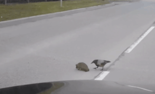 교통사고 당할 뻔한 고슴도치를 구한 까마귀…진실은? (영상)