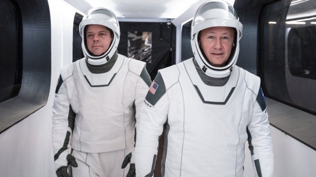 특히 세간의 눈길을 끈 것은 주인공인 두 명의 우주비행사가 입은 기존의 디자인과는 다른 우주복이었다. 미 항공우주국(NASA) 소속의 더글러스 헐리와 로버트 벵컨이 입고 등장한 이 우주복의 디자인을 한마디로 정의하면 턱시도와 슈퍼히어로 복장의 결합이다. 현지언론들은 두 우주인이 매끈한 흰색 정장을 입고 등장했다고 표현하기도 했지만 일각에서는 테슬라가 후원하는 자동차 경주대회 복장같다는 비아냥도 나왔다.