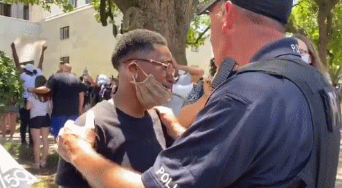 백인 경찰관은 자신의 오른손으로 흑인 청년의 어깨를 다독이며 “우리는 서로를 위해 여기에 있는거야, 날 봐”라고 말했다. 그는 이어 진정성이 담긴 목소리로 “나도 당신의 고통을 느낀다”고 덧붙였다.