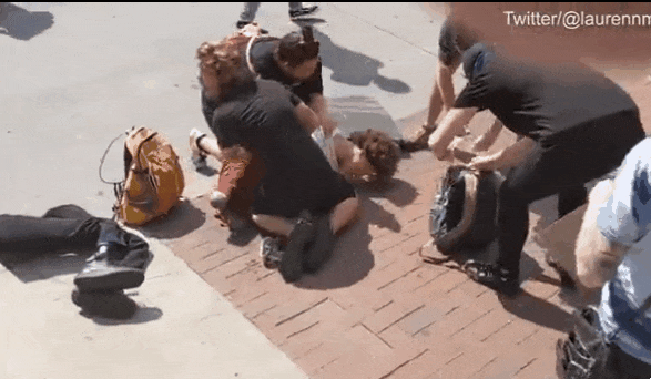 당시 경찰들은 이 남성을 포함한 시위대 전체에 후추 스프레이를 뿌리며 해산을 요구하고 있었다. 후추 스프레이의 ‘공격’을 받은 시위대가 연신 기침을 하거나 콧물을 흘리며 괴로워하는 사이, 경찰 일부가 피해 남성을 강하게 밀쳐 결국 넘어지고 말았다.