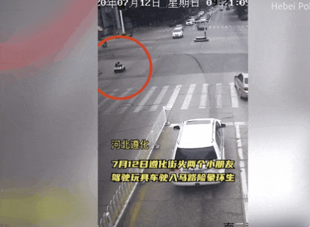 중국 후베이성 경찰 측이 공개한 영상은 허베이성 쭌화시의 한 4차선 도로에서 촬영됐다. 수많은 차가 오가는 차도에 등장한 것은 SUV 차량을 본따 만든 장난감 자동차였고, 자동차에 탑승한 ‘운전자’는 5~6세로 추정되는 어린아이 두 명이었다.