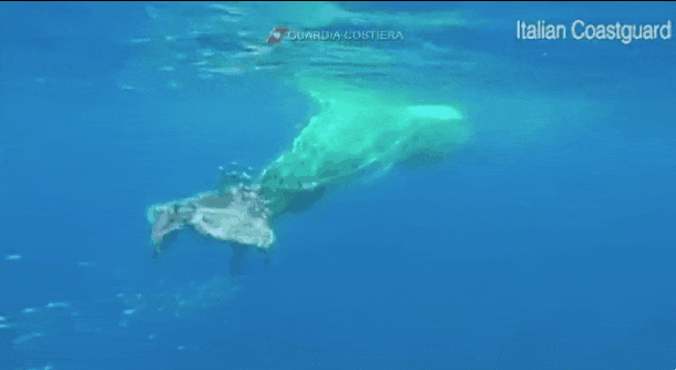 지난 18일, 지중해에 있는 이탈리아령 섬으로, 시칠리아섬에서 약 50㎞ 떨어진 곳에 있는 에롤리에제도에서 그물에 몸 전체가 휘감긴 채 고통스러워하는 향유고래 한 마리가 발견됐다.