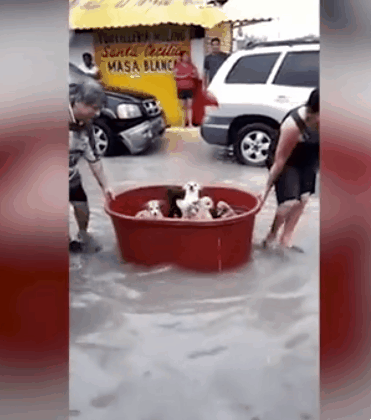 공개된 영상은 현지시간으로 지난 26일, 고무대야에 반려견들을 실은 채 안전한 곳을 찾아 이동하는 모습을 생생하게 담고 있다.