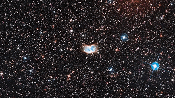 우주를 훨훨 날아다니는 나비처럼 보이는 이 행성상 성운은 푸른색 가스 주위를 붉은색 가스가 감싸고 있는 모습으로, 푸르게 빛나는 부분이 이온화된 산소 가스, 붉게 빛나는 것이 이온화된 수소 가스다. 나비 날개처럼 확산한 가스는 중심에서 최대 2광년 거리까지 퍼져 있다. 방출된 가스는 원래 별이 내뿜는 자외선을 받아 이온화돼 1만℃ 이상에 도달하면 별을 능가하는 밝기로 빛난다. 이런 양극성 형상은 행성상 성운의 약 10~20%에서 확인된다.