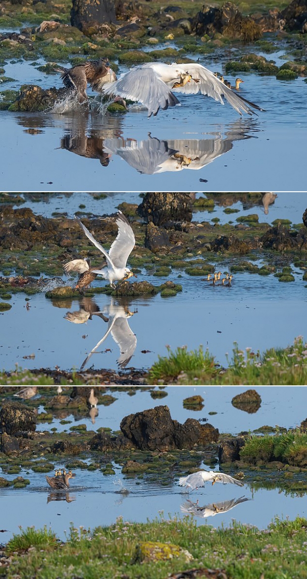 이에 대해 작가는 “야생에서 일어나는 완전히 자연스러운 일”이라면서 “이들 사진을 찍은 뒤 갈매기는 새끼 오리를 입에 문 채 멀리 해안선 쪽으로 날아갔다”고 말했다.