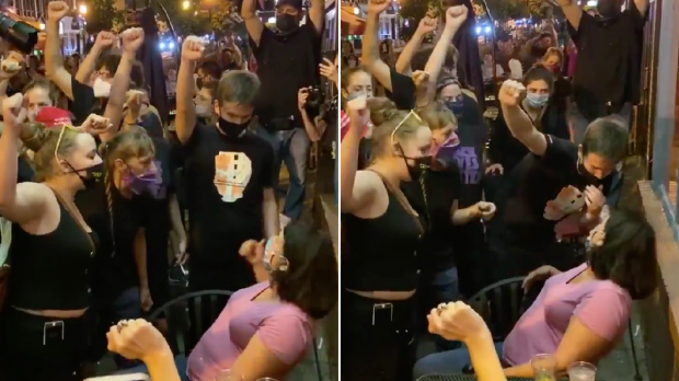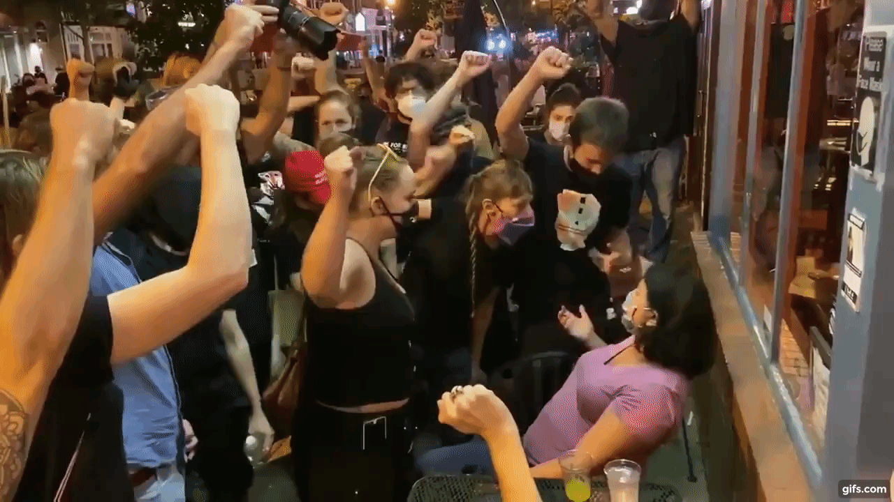 워싱턴 포스트의 프레드릭 컹클 기자가 26일(이하 현지시간) 트위터를 통해 지난 24일 수도 워싱턴DC에서 주로 젊은 백인들로 이뤄진 한 시위대가 시내 야외 레스토랑에 앉아있던 한 백인 중년 여성에게 다가가 자신들처럼 주먹을 들고 시위에 동참하라고 압박하는 순간을 담은 영상을 공유했다.