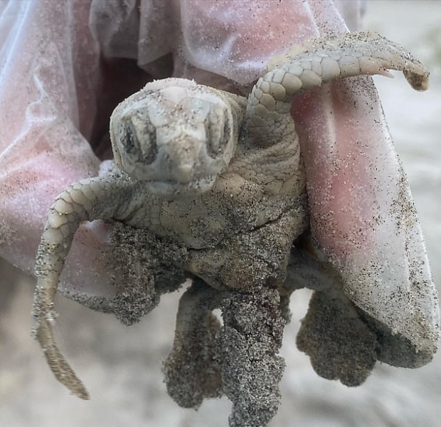 20일(현지시간) AP통신 등 외신은 미국 사우스 캐롤라이나 키아와 섬 해변에서 유전질환으로 인해 온몸이 흰색이 막 부화한 새끼 거북이 발견됐다고 보도했다.