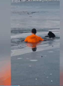 하지만 이 남성은 주저하지 않고 호수로 뛰어들었다. 호수 표면에 끼어 있는 얼음을 차근차근 깨부수며 개에게 다가갔고, 이내 개와 함께 무사히 안전한 곳으로 돌아왔다.