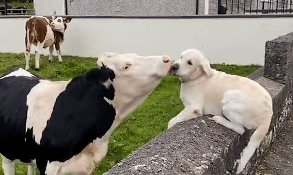 이 매체에서만 9만9000회 이상 공유된 이 영상은 아일랜드 퍼매너주 매과이어스브리지에 사는 파블로라는 이름의 2살 된 골른레트리버 한 마리가 3개월 만에 만난 절친 젖소에게 반가움을 표현하는 모습을 담고있다.