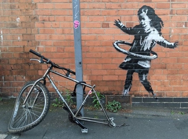 뱅크시의 신작인 '훌라후프 소녀’는 자전거 타이어로 훌라후프를 돌리는 소녀의 모습을 묘사한 작품으로, 벽화 앞에는 뒷바퀴가 빠진 실제 자전거까지 설치되어 있어 사실감을 더했다.