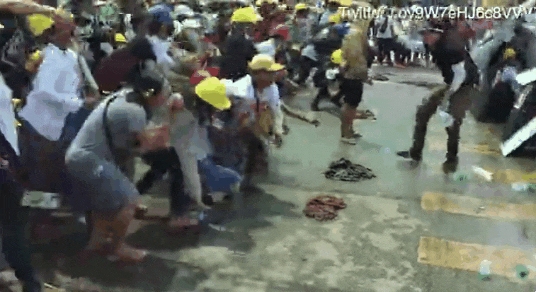 대규모 시위가 벌어지는 주요도시 중 한 곳인 양곤에서는 두 패로 나뉜 시위대가 각각 군경과 시위대의 역할을 맡은 뒤 실전을 방불케 하는 훈련을 진행했다.