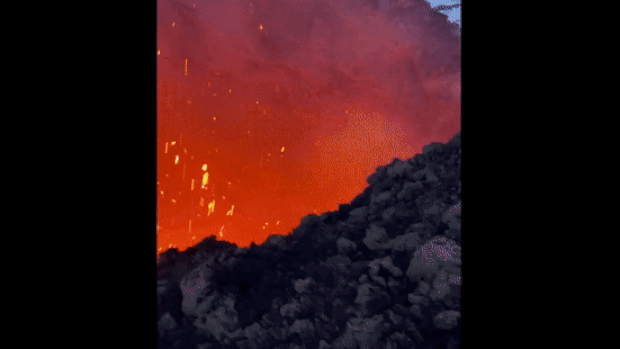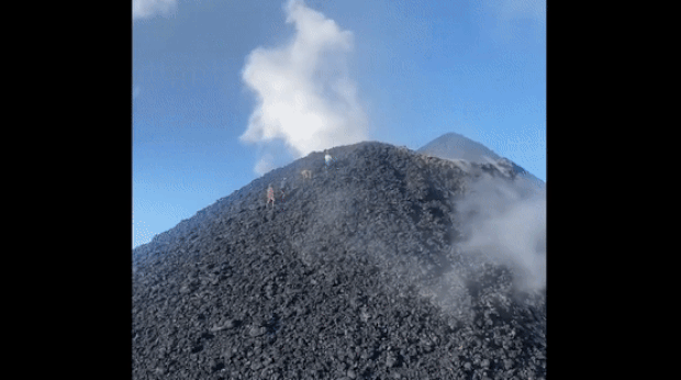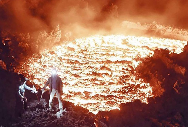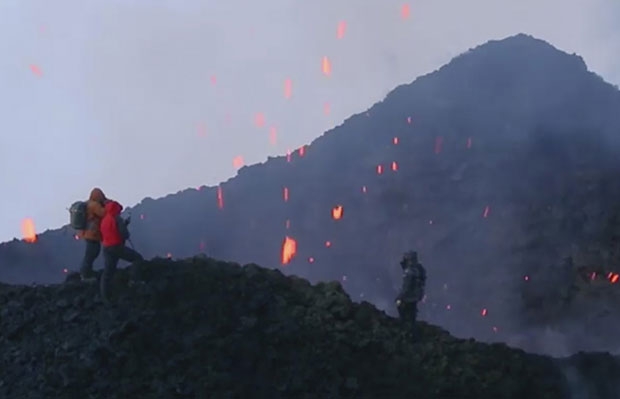 마침내 분화구와 인접한 화산 테두리에 다다른 이들은 분화구에서 솟구치는 시뻘건 ‘용암 폭탄’(화산탄)을 배경으로 셀카 삼매경에 빠졌다. 분화구 안을 들여다보는 대담무쌍함도 보였다. 용암 조각에 프라이팬을 올려놓고 소시지를 구워내며 활화산의 열기를 만끽했다.