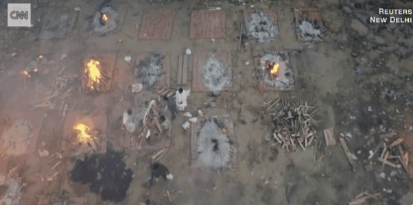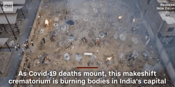 사망자가 급증함에 따라 전국의 화장장은 시신을 화장하려는 유가족들로 붐비고 있다. CNN과 로이터가 공개한 영상은 현지시간으로 22일 뉴델리의 수많은 시신이 쉴 새 없이 화장되는 뉴델리의 한 화장장의 모습을 생생하게 담고 있다.
