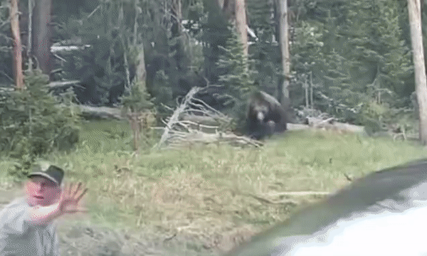 1일(이하 현지시간) 미국 USA 투데이 보도에 따르면, 지난달 28일 옐로스톤 국립공원 부지 도롯가에서 교통정리를 하던 공원 경비원을 향해 회색곰 한 마리가 돌진했다.