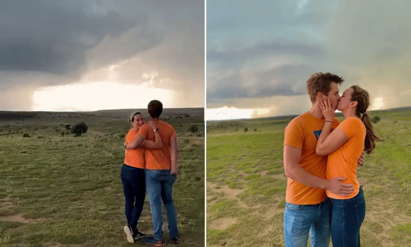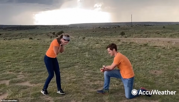 위치토이글 등 현지매체 보도에 따르면, 한 기상학자가 최근 토네이도 앞에서 연인 사이인 동료 기상학자에게 멋지게 프러포즈하는 데 성공했다.