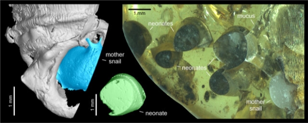 독일 젠켄베르크 자연사박물관의 과학자들은 미얀마에서 발견된 9900만 년 전 호박 속에서 보통은 보기 힘든 장면을 목격했다. 호박 속 생물은 달팽이인데, 곤충이 아닌 달팽이라는 점이 특이한 게 아니라 달팽이 옆에 있는 작은 달팽이 5마리가 가장 독특한 부분이었다. 새끼 달팽이가 큰 달팽이와 함께 호박 속에 있는 게 우연이 아니라고 생각한 연구팀은 이 화석을 고해상도 CT 스캔으로 정밀하게 관찰했다. 그 결과 예상대로 이 달팽이들은 출산 중인 암컷과 그 암컷이 낳은 새끼 달팽이들이었다. 즉 백악기 달팽이의 출산 장면이 호박 속에 그대로 보존된 것이다.