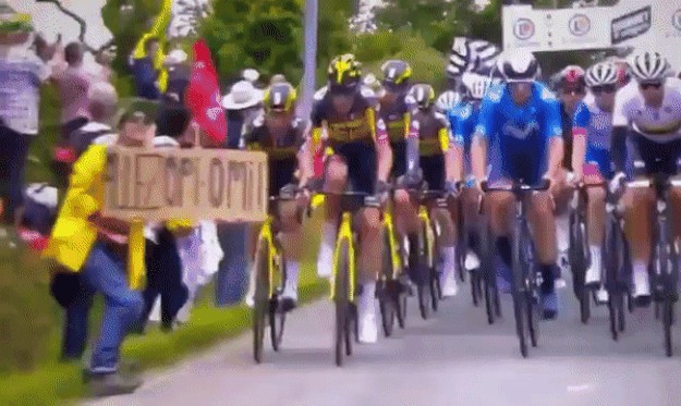 도로 안 쪽으로 발 하나를 걸친 관중은 경기가 한참 진행 중인 상황에서 중계 카메라 쪽을 향해 불쑥 ‘힘내세요 할아버지 할머니(allez opi omi)’라고 적힌 팻말을 들이밀었다. 그 바람에 같은 팀 리더인 슬로베니아 프리모즈 로글리치(31)를 보조하며 달리던 독일의 베테랑 사이클선수 토니 마틴(36)이 팻말에 부딪혀 넘어졌고, 뒤를 따르던 선수 100여 명이 줄줄이 충돌했다.