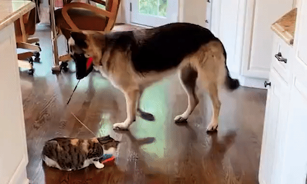 [영상] 낚시 장난감 입에 물고 새끼 고양이 놀아주는 견공