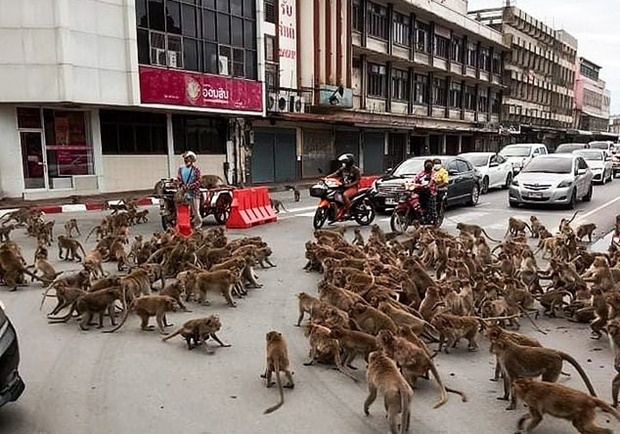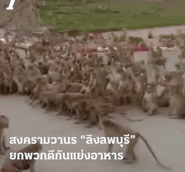 25일 저녁, 롭부리 시내의 한 교차로에서 두 원숭이 패거리가 맞붙었다. 서로를 노려보며 한참을 대치하던 원숭이 수백 마리는 급기야 도로를 점거하고 집단 난투극을 벌였다. 날카로운 소리를 내며 한데 뒤엉켜 패싸움을 시작했다.