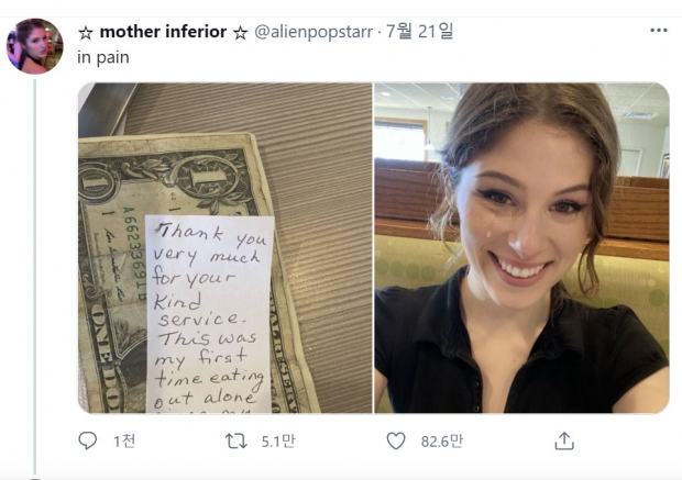 지난 21일 메건 킹이라는 이름의 여성 종업원은 지금까지 82만 회 이상의 추천을 받은 화제의 트윗을 통해 두 장의 특별한 사진을 공유했다. 첫 번째는 그녀가 팁과 함께 받는 쪽지 사진, 그다음 사진은 이를 읽고 나서 흐르는 눈물을 미처 멈추지 못하고 미소 짓는 자신의 모습을 담고 있는 것이었다.